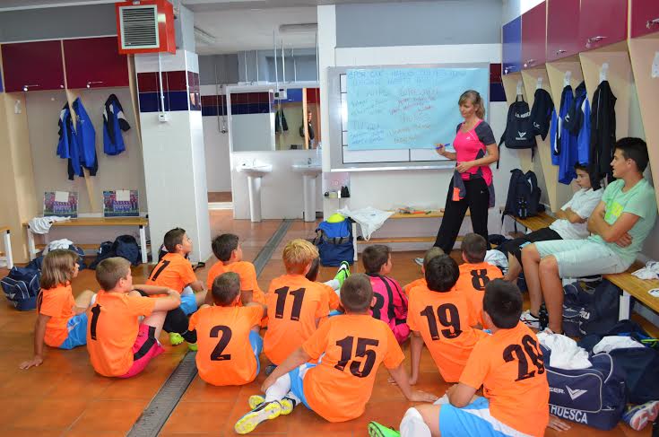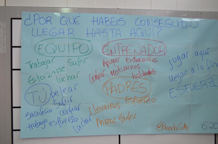 Realizamos una dinámica centrada en destacar que era lo que les había hecho llegar a ese día soñado y poder jugar en el campo del Alcoraz. Uno a uno fueron destacando que había aportado el equipo, cada uno de ellos, su entrenador y sus padres. Mi objetivo era que fueran conscientes y verbalizaran que detrás está su esfuerzo, constancia, sacrificio, apoyo, unión…que sin esto no se llega a ningún sitio. Y también responsabilidad y toma de decisiones, que curiosamente tuvieron que poner en práctica ya que al llegar a la final coincidió con un viaje de estudios del colegio y tuvieron que decidir qué hacer, sin presiones apoyados por su entrenador y padres respetando la decisión de su hijo.